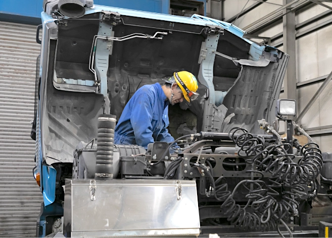 運送業において、輸送車両は常に安全でなければなりません。当社は、車検、定期点検を行える設備を自社で保有しており、車両整備のプロフェッショナルを配備。独自の整備スケジュールに合わせたオイル交換やエンジンルームの点検などを全車両に義務付け、常に安全な状態で運行できるよう注力しています。