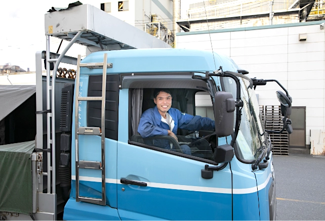 運転業務の初日、しばらくは、先輩の隣で見学することからスタートするのだろうと思っていましたが、初日から10トントラックでお客様への納品を命ぜられました。教習所とは感覚が全く違い、冷や汗でびっしょりだったことを覚えています。先輩が隣で「この納品先はここから入る」「ここに停めてはだめ」といった納品先ごとのルールなどを教えていただきました。こうした指導を約2か月やっていただいたことで、運転にも早く慣れ、納品先のことも理解できました。実践的な教えがあったからこそ、早く独り立ちできたと思っています。